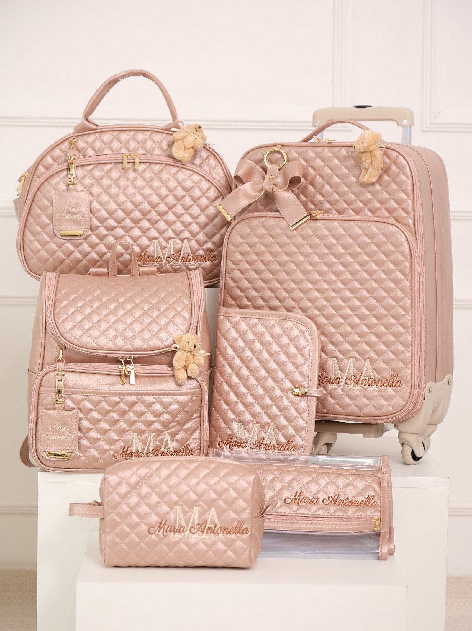 Peças confeccionadas no Poa Rose material sintético, acabamento em matelassê, metais inoxidáveis e forro impermeável.