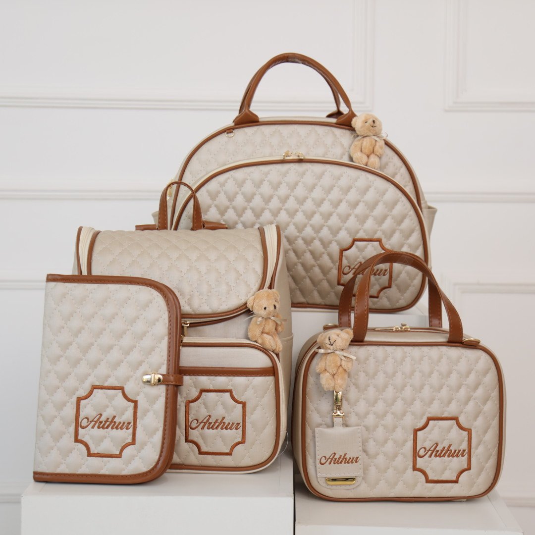Peças confeccionadas no Bege Duna material sintético, com detalhes e acabamento no material sintético caramelo e acabamento em matelassê, metais inoxidáveis e forro impermeável.
